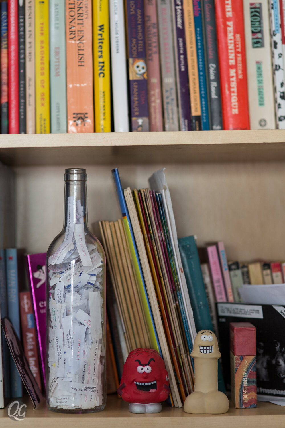 N: I haven’t cause it's really hard to take them out. That's sort of the point of them being in the bottle. Every once in a while I take a stick and push them down a little further. Sometimes they are not ones I get out of a fortune cookie. Sometimes I find them places. Like if I find them on the street or something like that, then I feel like this is a fortune meant for me so I'll take it.